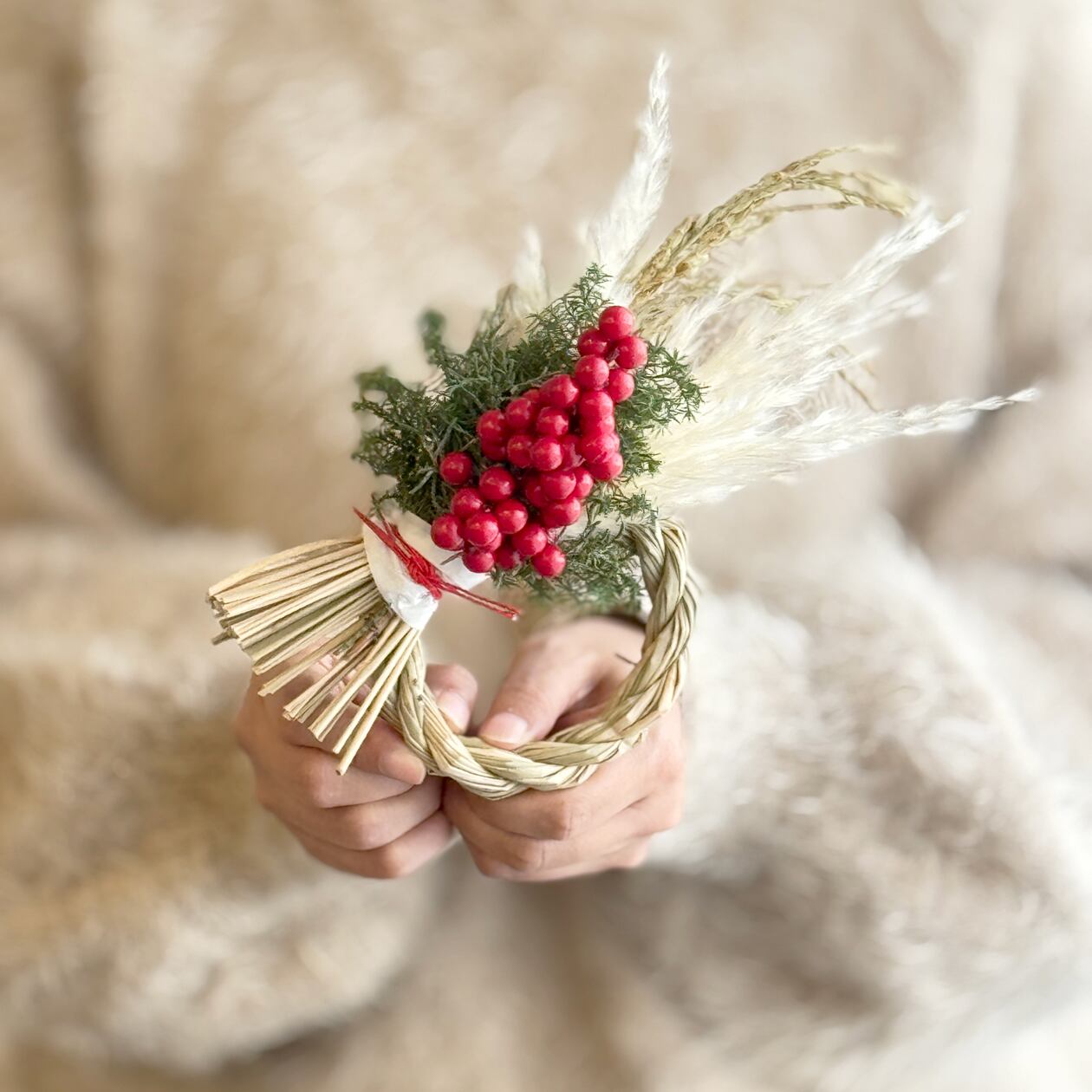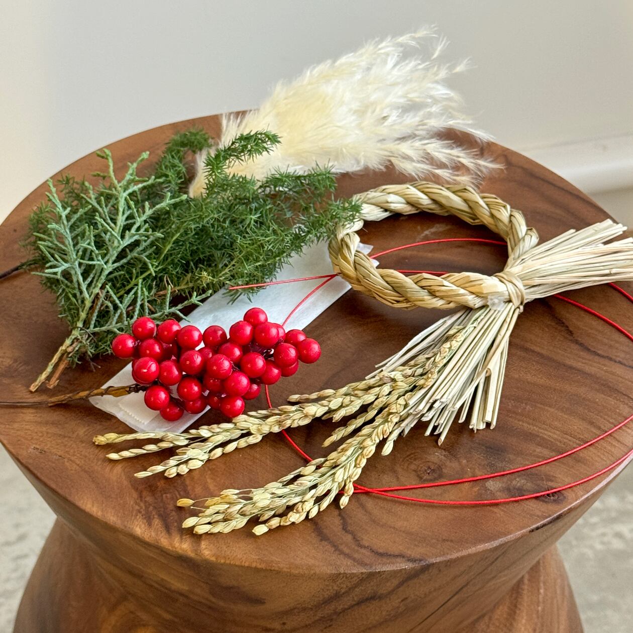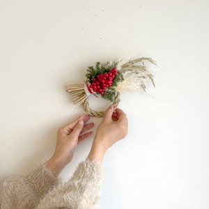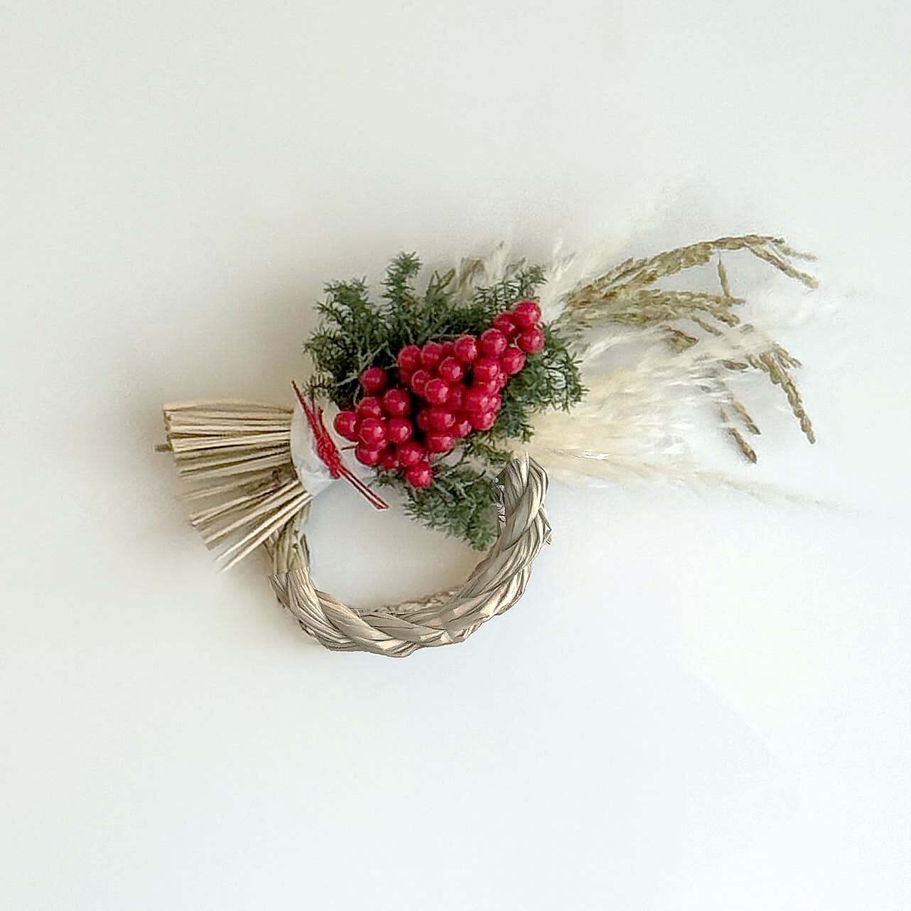(しめ縄、パンパスグラス、稲穂、南天の実、ヒムロ杉、水引、薄紙)