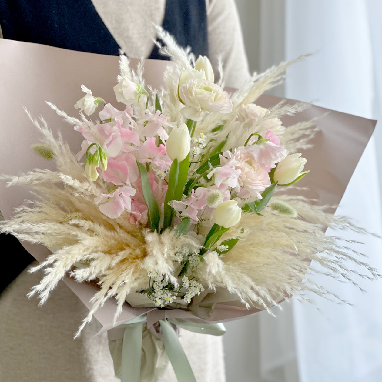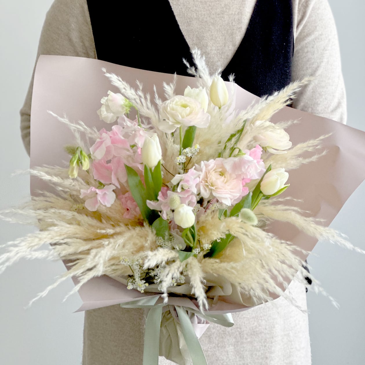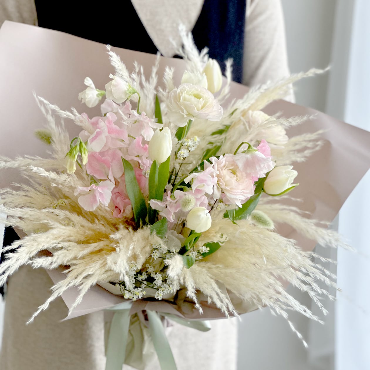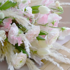 ・チューリップ、スイトピー、ラナンキュラス、ドライパンパスを長持ちするよう丁寧に処理して制作いたします。