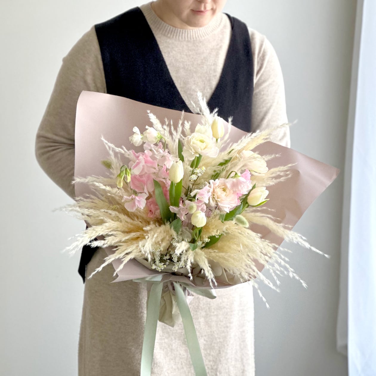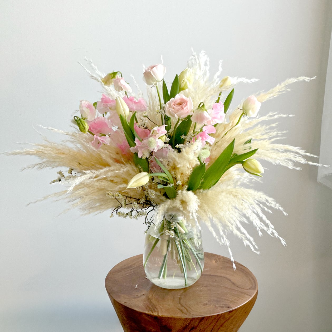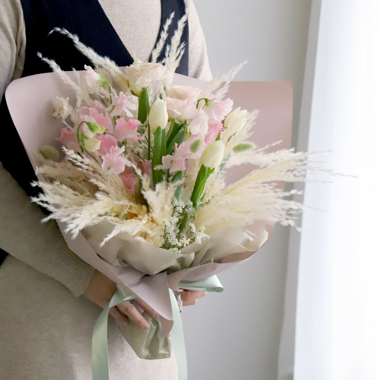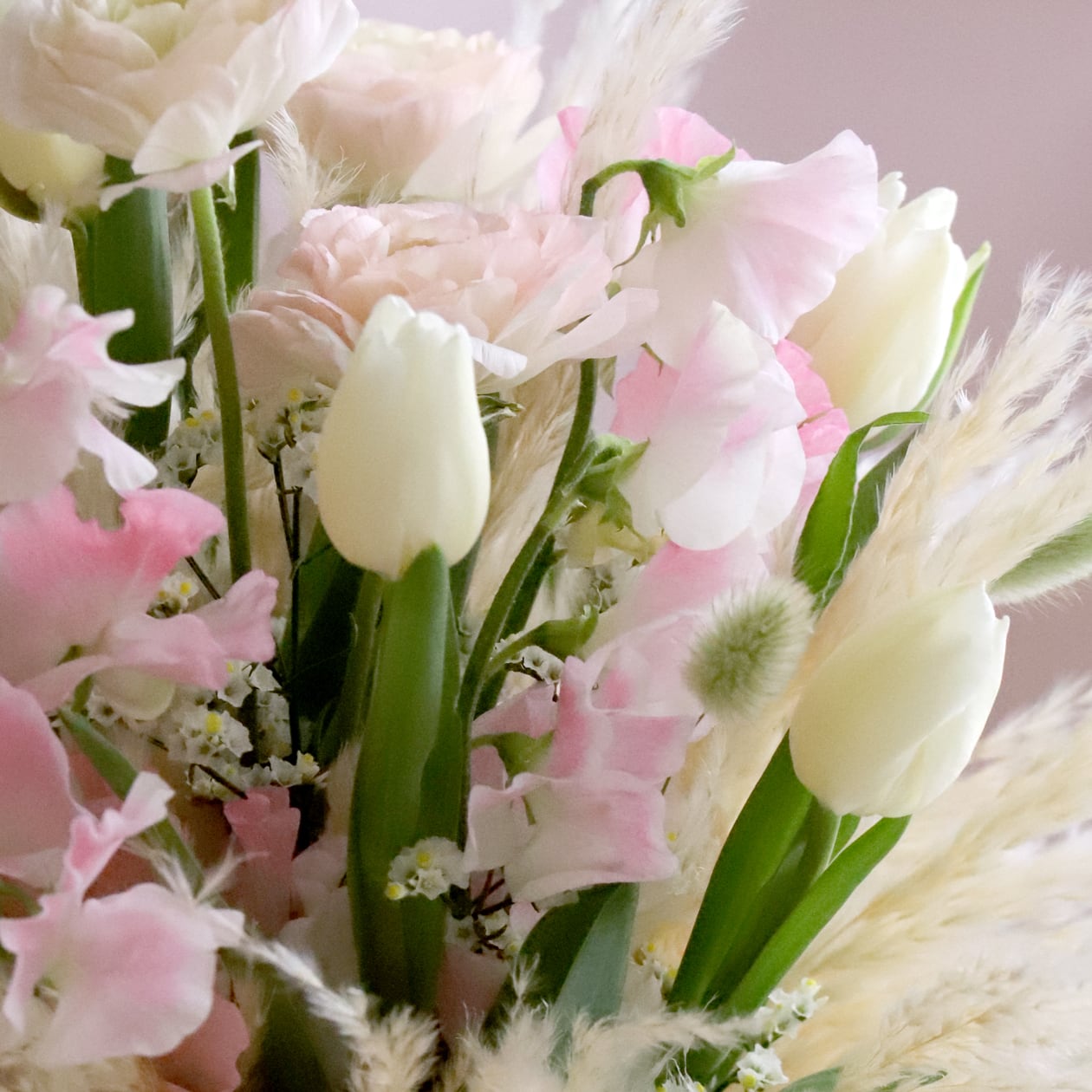 ・チューリップ、スイトピー、ラナンキュラス、ドライパンパスを長持ちするよう丁寧に処理して制作いたします。