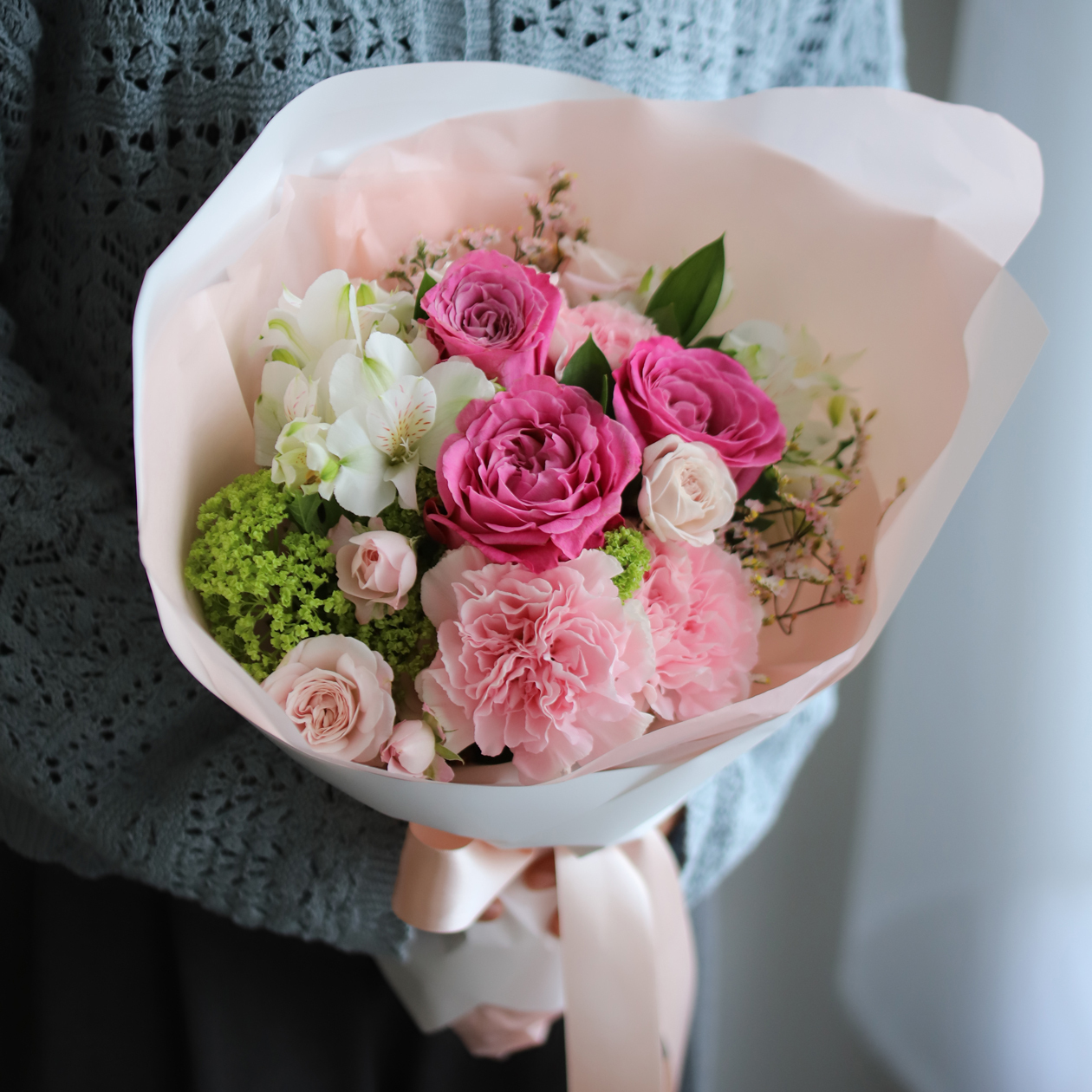 バラ、カーネーション、その他季節のお花を長持ちするようていねいに処理して制作いたします。写真はイメージとなります。その他のお花の種類はお任せください。