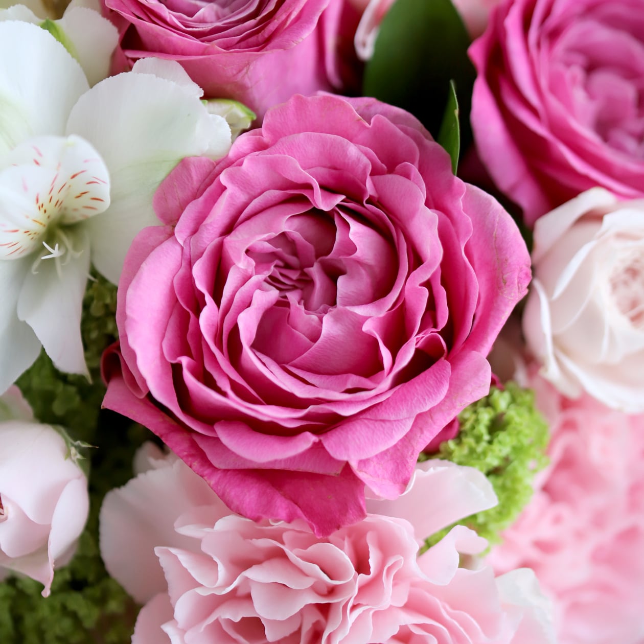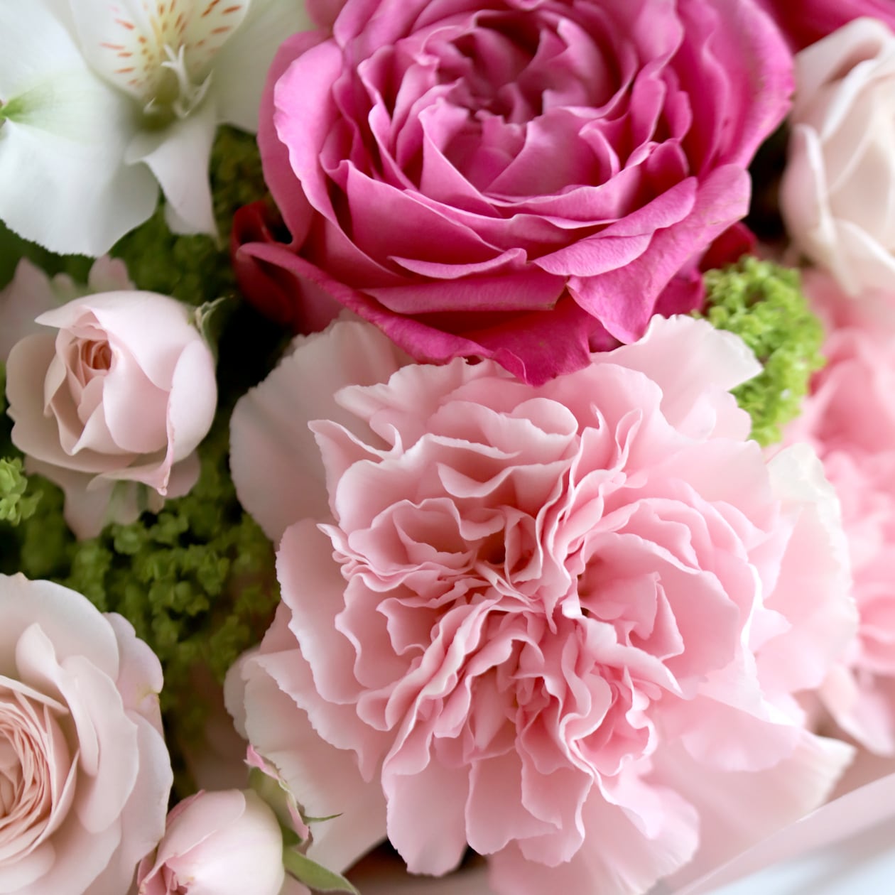大ぶりのカーネーションやグリーンを合わせて。