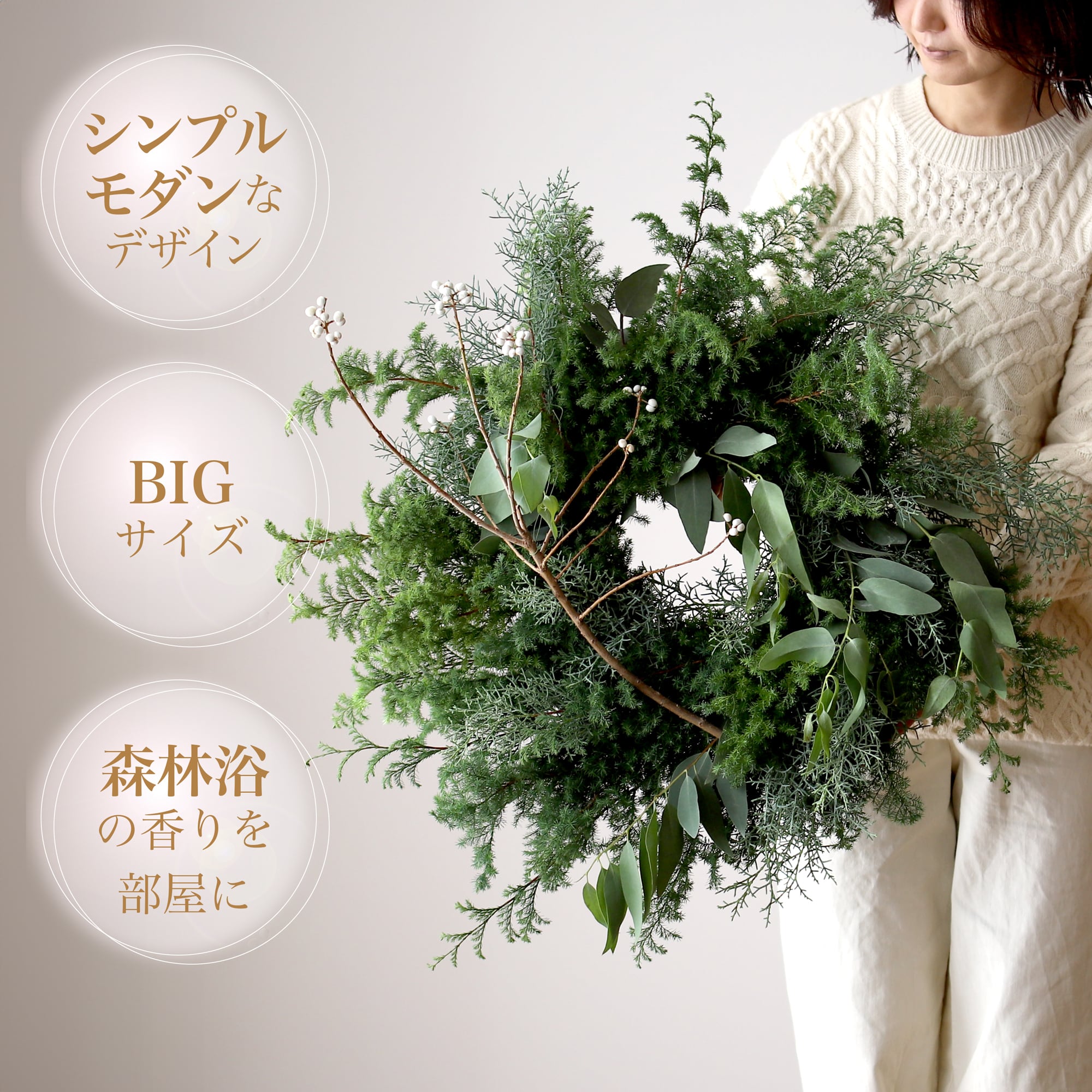 ※店舗用など“さらに大きめのリース”をご希望の方はプルダウンメニューからサイズアップ(+500円)をご指定下さい。サイズアップは直径約80cm~となります。
