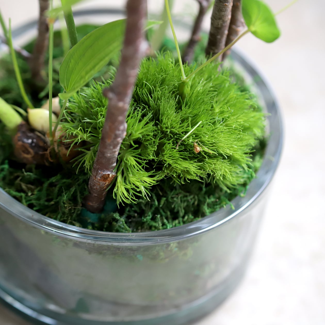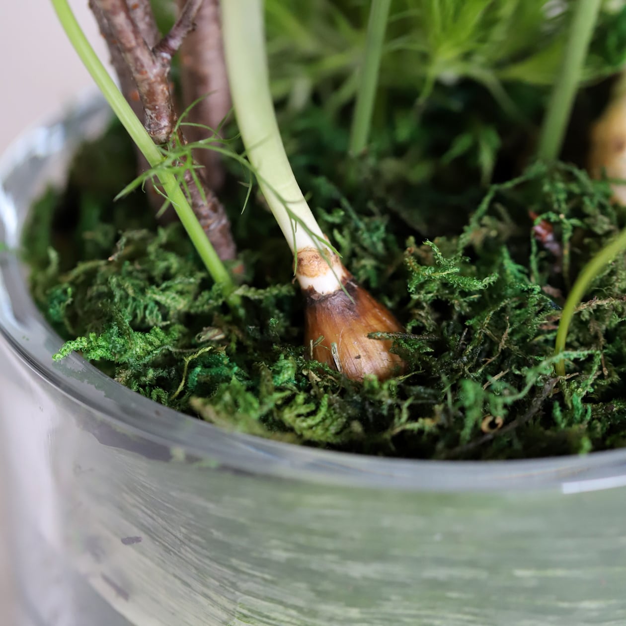 苔や球根の静かな存在感が重なり、